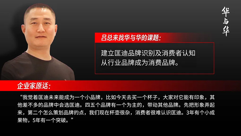 有了很雄厚的實(shí)力和很恰當(dāng)?shù)臅r(shí)機(jī),呂總就希望建一個(gè)品牌,讓人能夠知道他的匡迪,希望大家今天去買(mǎi)一個(gè)杯子,讓大家對(duì)匡迪能有印象。所以2023年來(lái)找華與華,開(kāi)啟了匡迪的品牌建設(shè)之路。