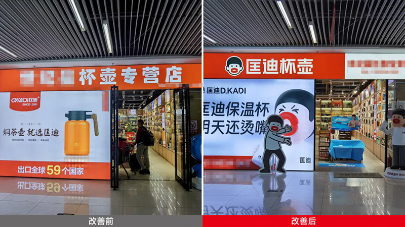 走進(jìn)門(mén)店,你會(huì)發(fā)現(xiàn)我們把原來(lái)的貨架改造成了“發(fā)光海報(bào)”,匡迪的標(biāo)志、燙嘴哥形象和企業(yè)背書(shū)全都亮在那里,讓人不由自主想進(jìn)店一探究竟。