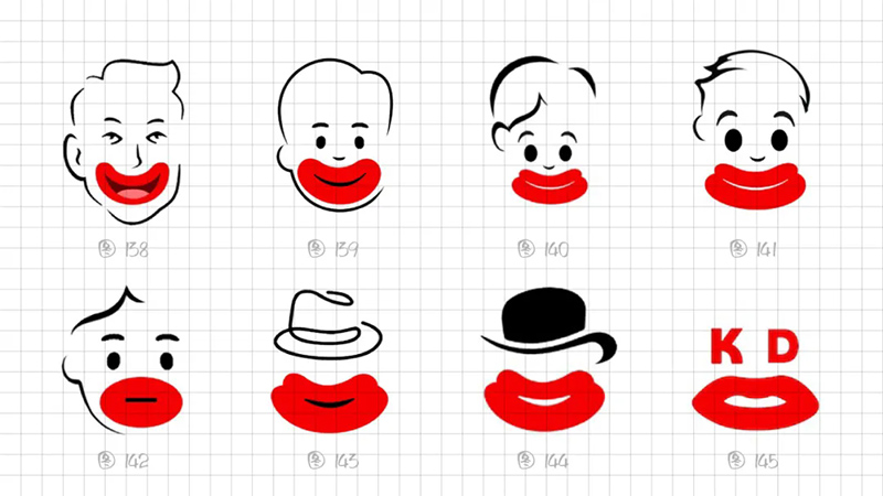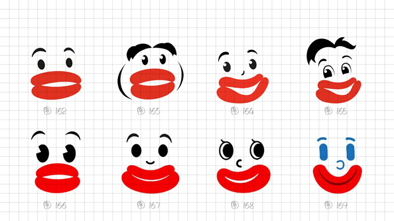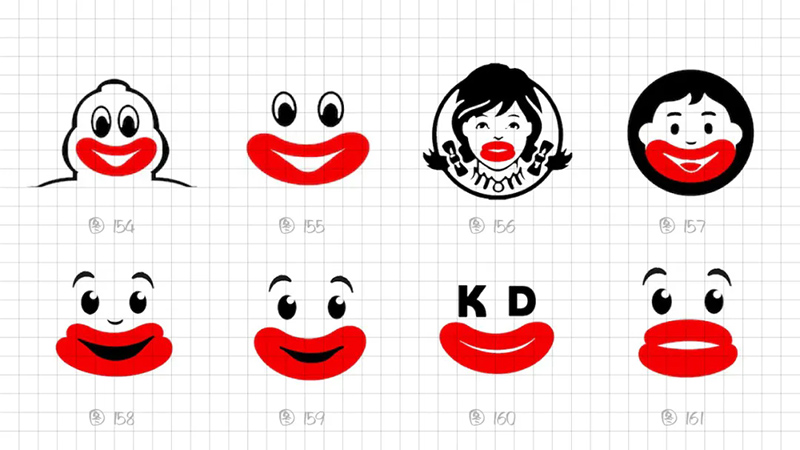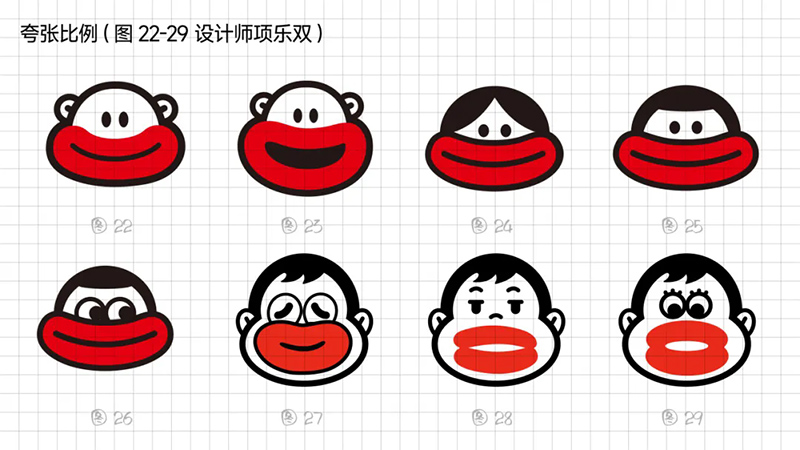 1)比例夸張:平面構(gòu)成中,特異是一個提升識別度和獨特性的表現(xiàn)手法,抓住香腸嘴“面部占比大”的特性,嘗試放大嘴唇輪廓到極致,夸張到比臉還大。