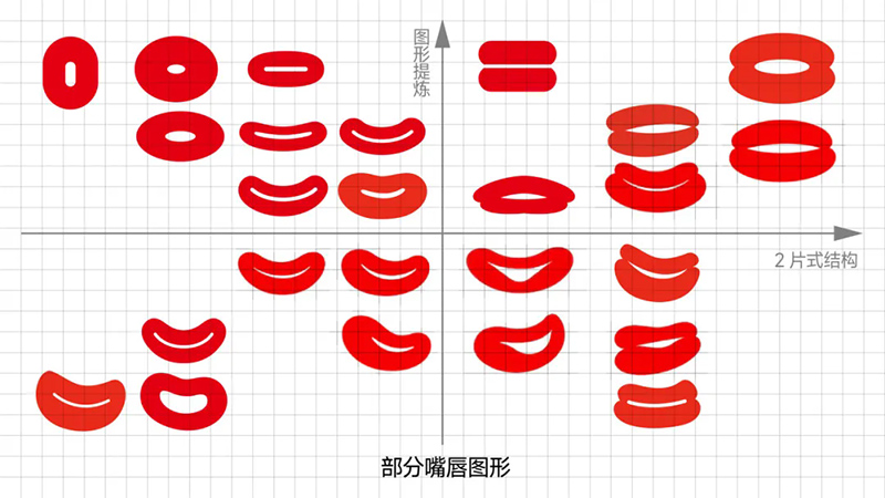 5)嘴唇圖形的提煉:進行了寫實、概括、提煉、變化的不同嘗試,我們重新整理復(fù)盤,嘴唇的簡化圖形,從構(gòu)成上主要分成2種,是2個橢圓,還是3個橢圓的變形(下圖)。