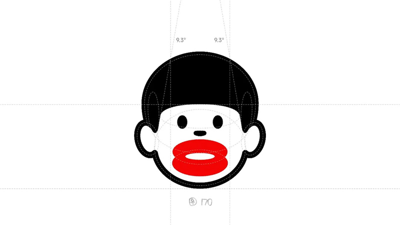 6)調(diào)整比例與簡化細節(jié):事情的結(jié)果總是不知不覺中就出現(xiàn)了,把頭發(fā)用最簡單的表現(xiàn)形式——平劉海跟燙嘴哥相結(jié)合,頭發(fā)形成一個幾何面,與嘴唇在圖形配重就能達到平衡,整體輪廓線條等粗,眼睛的2個橢圓點畫龍點睛。